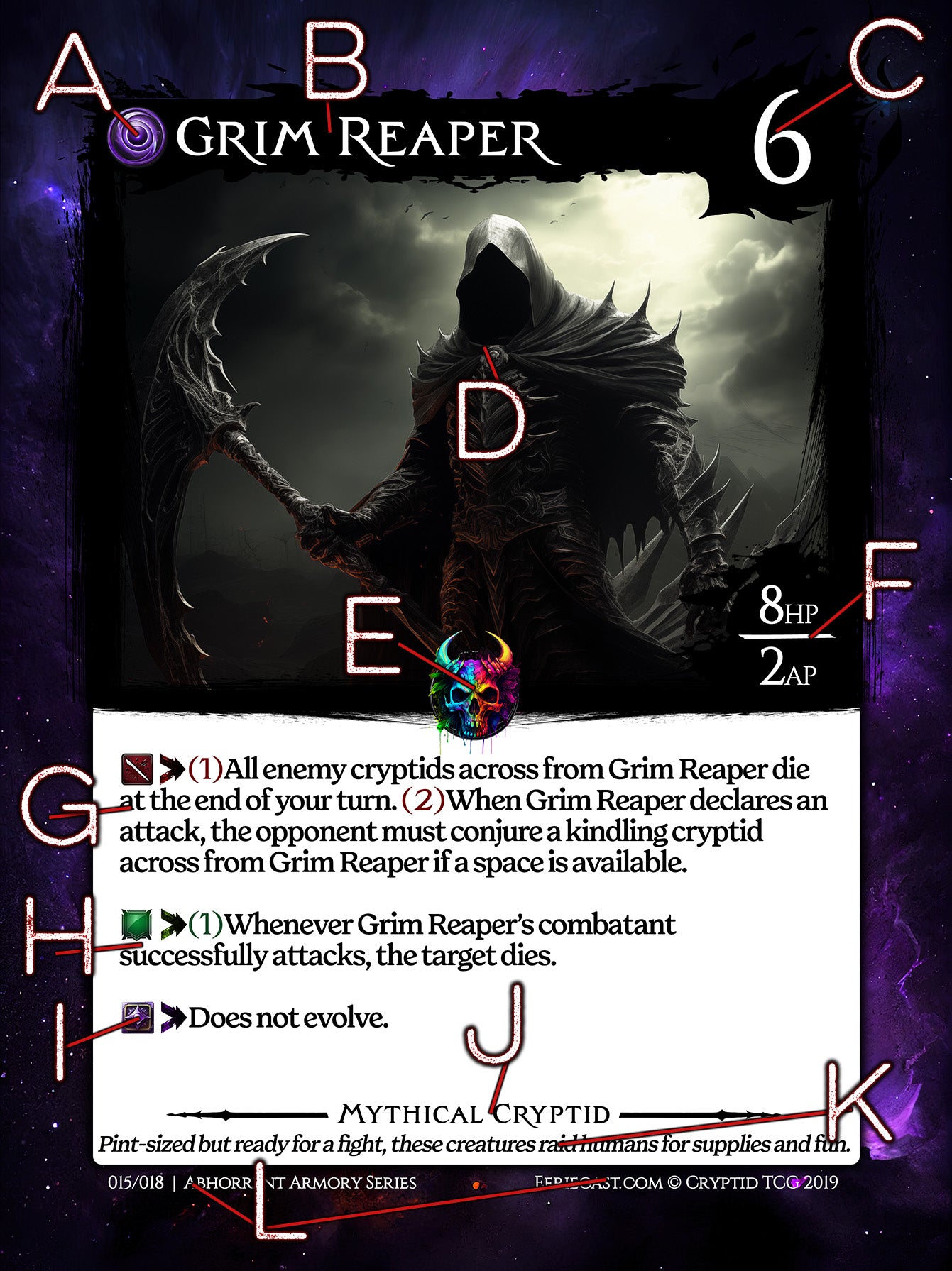 A Cryptid's name not only identifies it, but also groups it under a category. For example, any card or card ability which targets Vampire Cryptids would work on Cryptids named "Vampire Initiate" and "Elder Vampire".