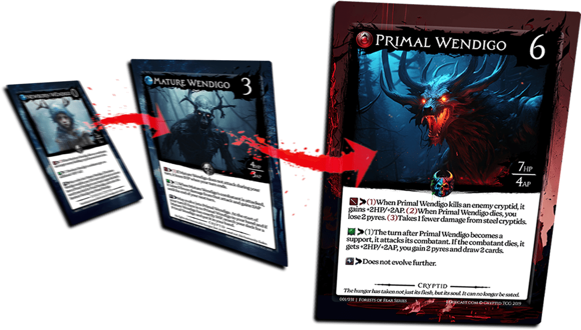 For example, if you have an Adolescent Bigfoot on your field already, and you have an Adult Bigfoot in your hand, even if it says it costs 7 Pyres to conjure, you may instead evolve Adolescent Bigfoot into the Adult Bigfoot straight from your hand during your turn without paying the Pyre Cost.