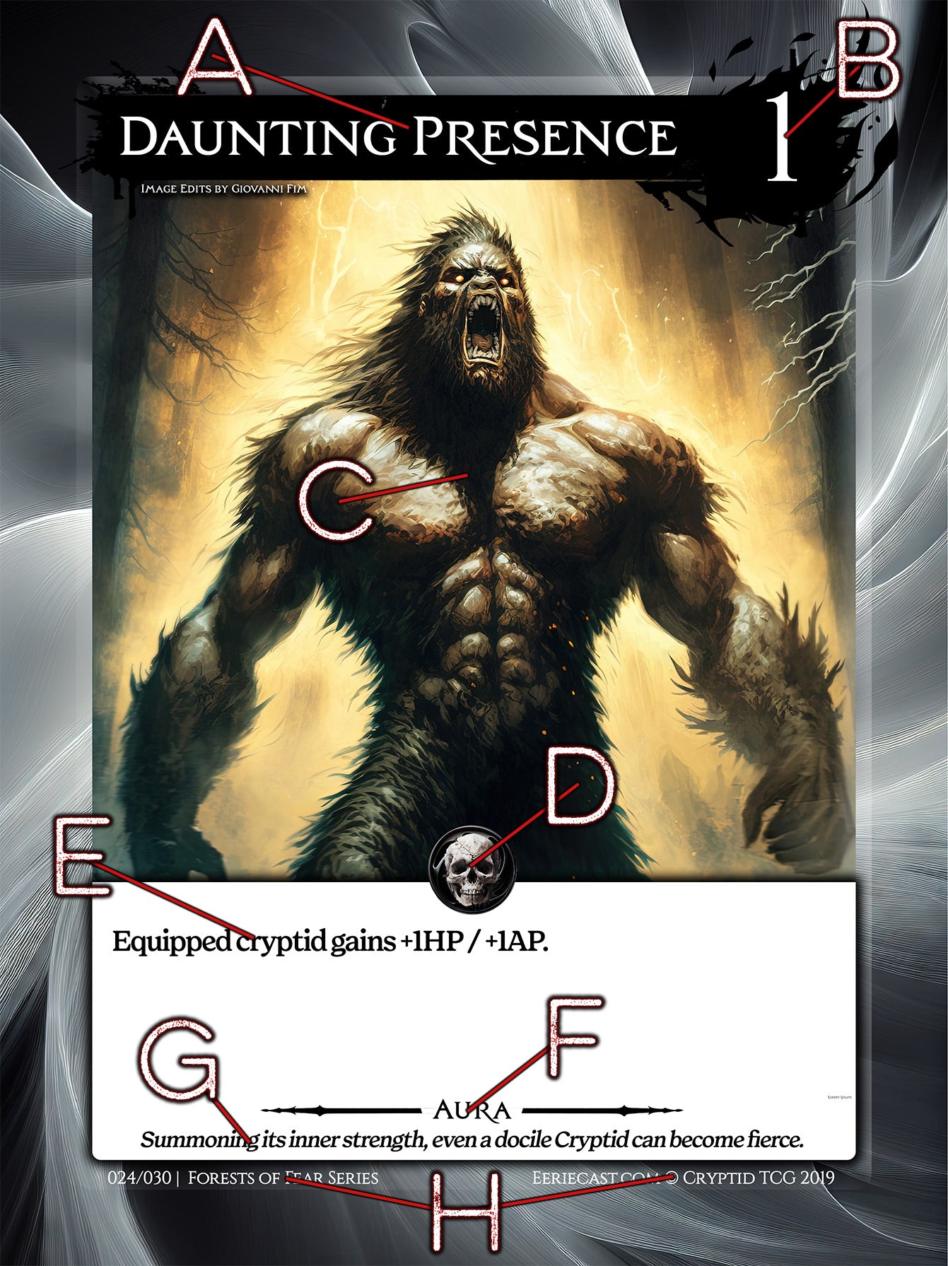 - Aura: Auras are permanent buffs to your Cryptids. When you conjure an Aura card, you must target a Cryptid to "equip" it to. Afterwards, that Cryptid gains the effects listed in the Instance Effects on the card. If an Aura equipped to your Cryptid is destroyed or removed, the effects are removed as well. If this causes a Cryptid's HP to fall to 0 or lower, it dies. If a Cryptid dies and it had Auras or Attacks equipped to it, those cards must be placed in the discard pile.